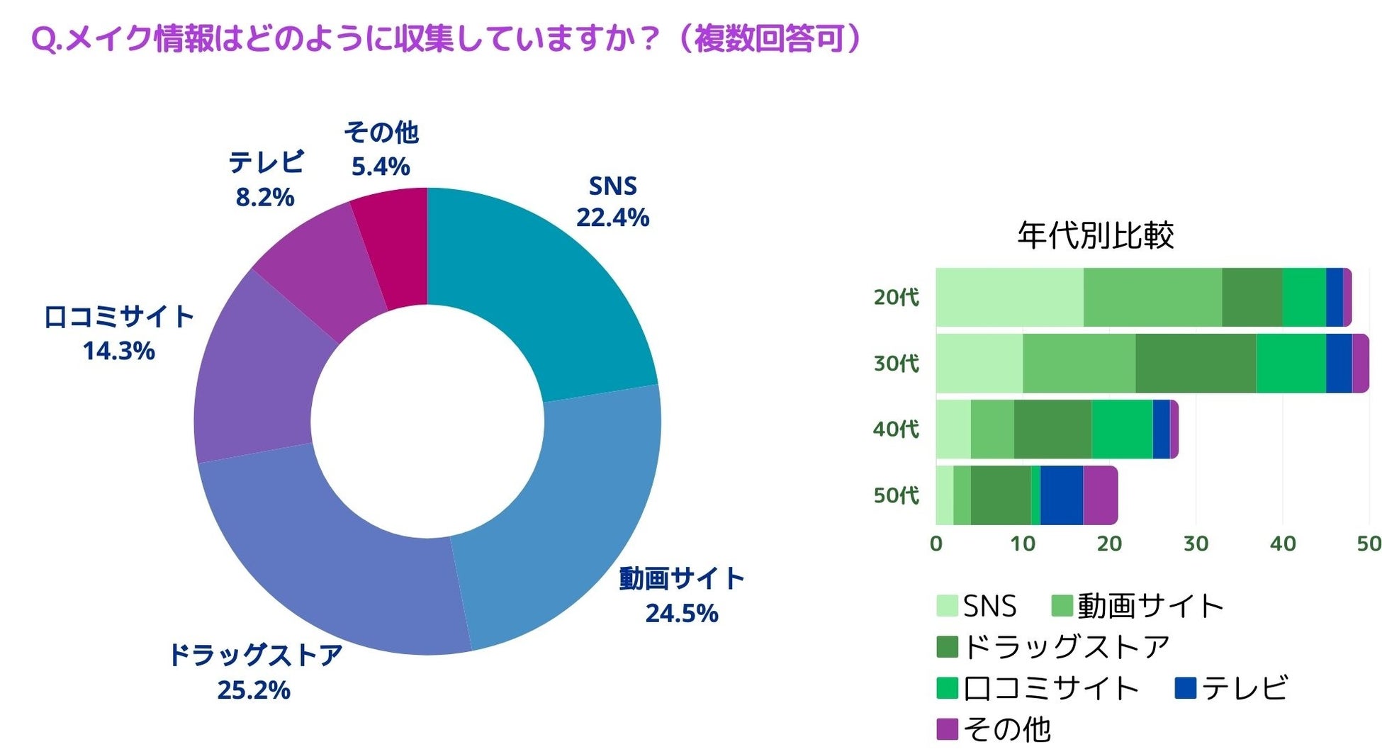 メイク情報をどのように収集しているかお聞きしたところ、「SNS(22.4%)」、「動画サイト(24.5%)」、「ドラッグストア(25.2%)」、「口コミサイト(14.3%)」、「テレビ(8.2%)」、「その他(5.4%)」という結果になりました。