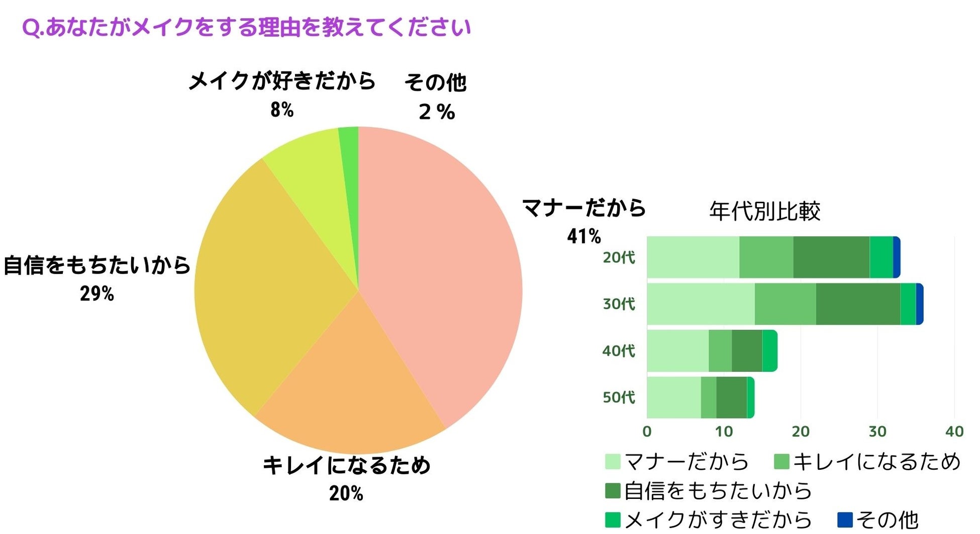 メイクをする理由をお尋ねしたところ、「マナーだから(41%)」、「キレイになるため(20%)」、「自信をもちたいから(29%)」、「メイクが好きだから(8%)」、「その他(2%)」という結果になりました。