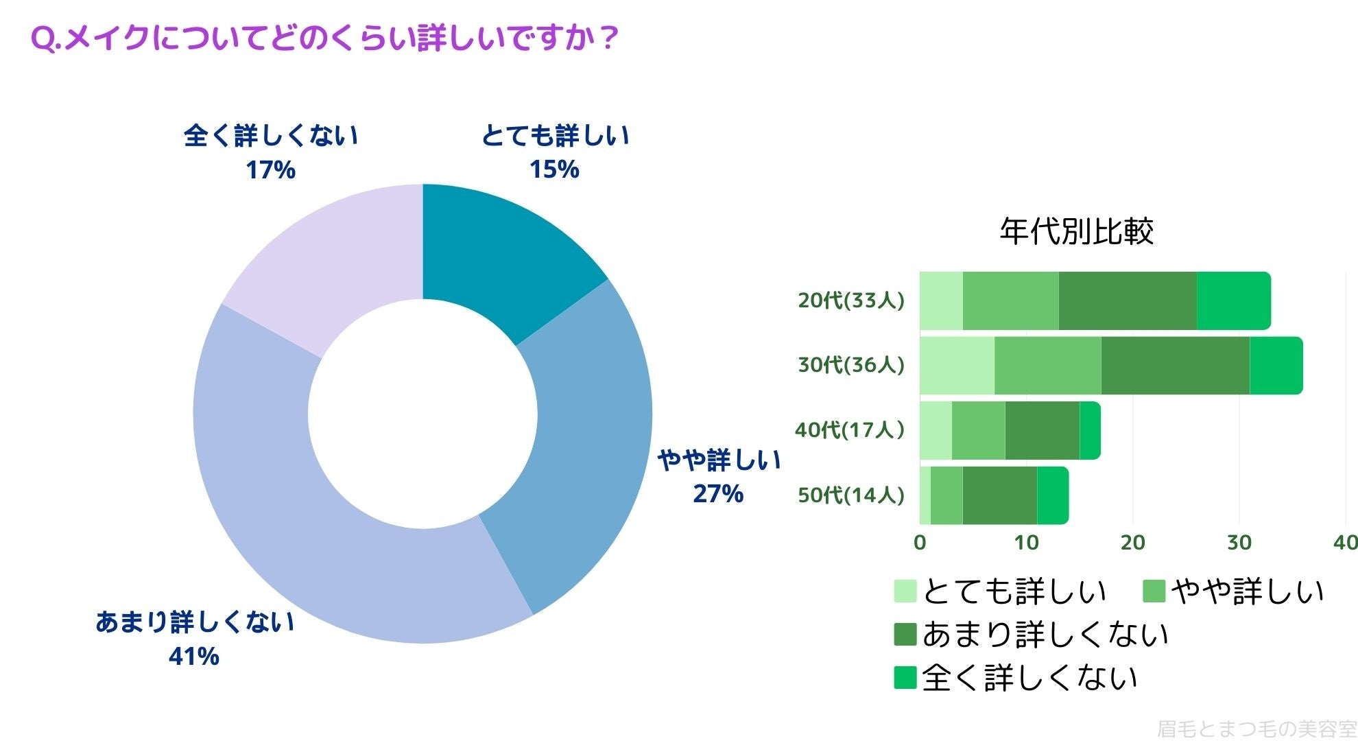 メイクについてどのくらい詳しいかお聞きしたところ「とても詳しい(15%)」、「やや詳しい(27%)」、「あまり詳しくない(41%)」、「全く詳しくない(17%)」という結果になりました。