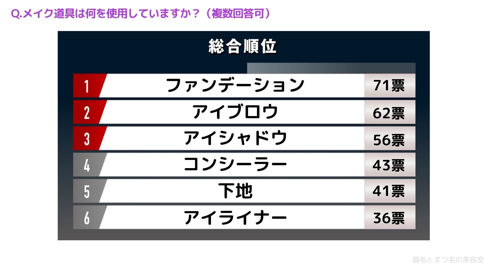 使用しているメイク道具をお聞きしたところ「1位>ファンデーション(71票)」、「2位>アイブロウ(62票)」、「3位>アイシャドウ(56票)」、「4位>コンシーラー(43票)」、「5位>下地(41票)」、「6位>アイライナー(36票)」という結果になりました。