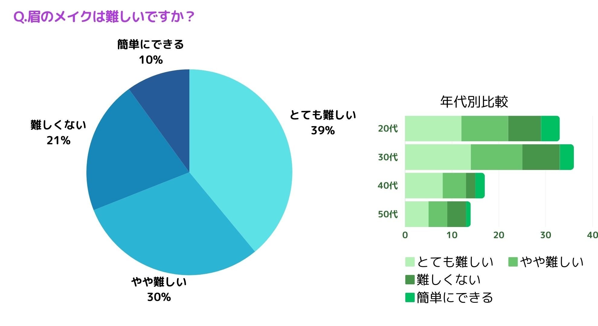 眉毛のメイクが難しいかお聞きしたところ「とてもむずかしい(39%)」、「やや難しい(30%)」、「難しくない(21%)」、「簡単にできる(10%)」という結果になりました。