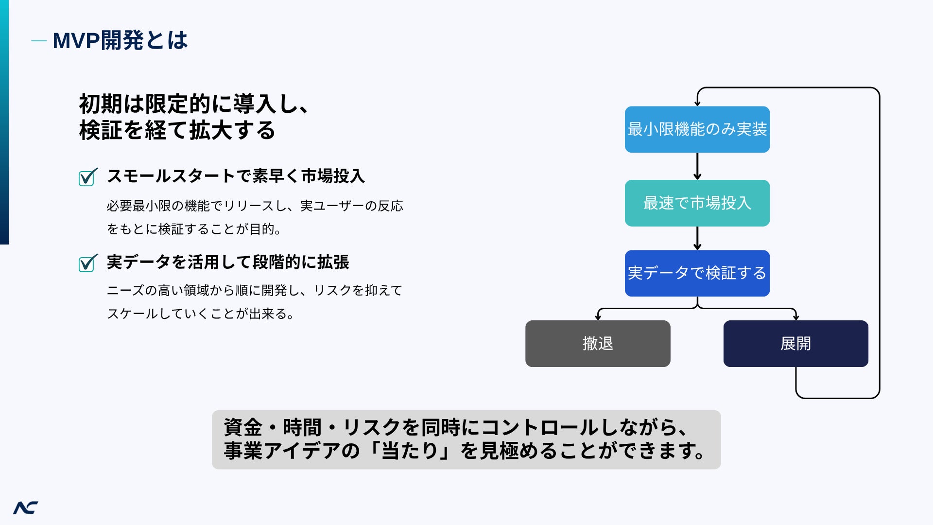 限られた経営資源で素早く検証・改善を繰り返す「MVP開発」の重要性が高まっていますが、事業立ち上げノウハウと技術を兼備した人材は希少で、実践できる企業は多くありません。