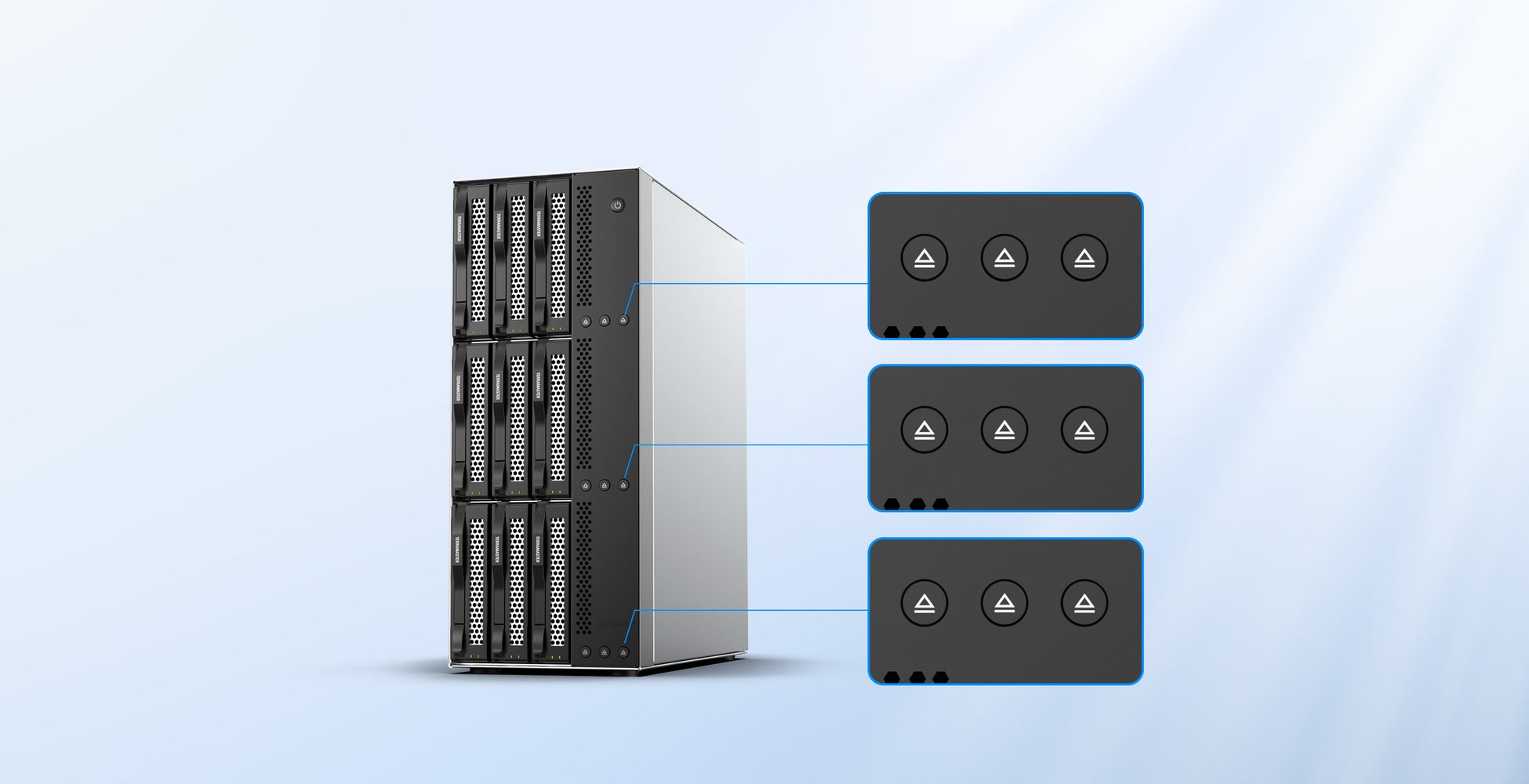 ■ 9台HDD対応・電源管理&安全取り出し機能D9-320は、9個の物理電源スイッチに加え、マスターコントロールスイッチを備えた設計により、二重の保護を実現しております。アイドル状態のドライブを正確に停止することで、最大70%の電力消費削減を可能とし、UPSのインテリジェント電源オフ保護システムと連動して、予期せぬ停電時に自動でヘッドパーキングおよびデータキャッシュ保護を実施。従来製品と比較し、データ安全性を300%向上いたします。