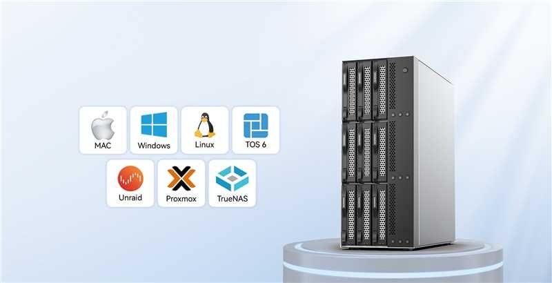 多用途性を追求したD9-320は、Windows、Mac OS、Linux、TerraMaster OS、Unraid、TrueNAS、Proxmoxなど、各種オペレーティングシステムとシームレスに連携。