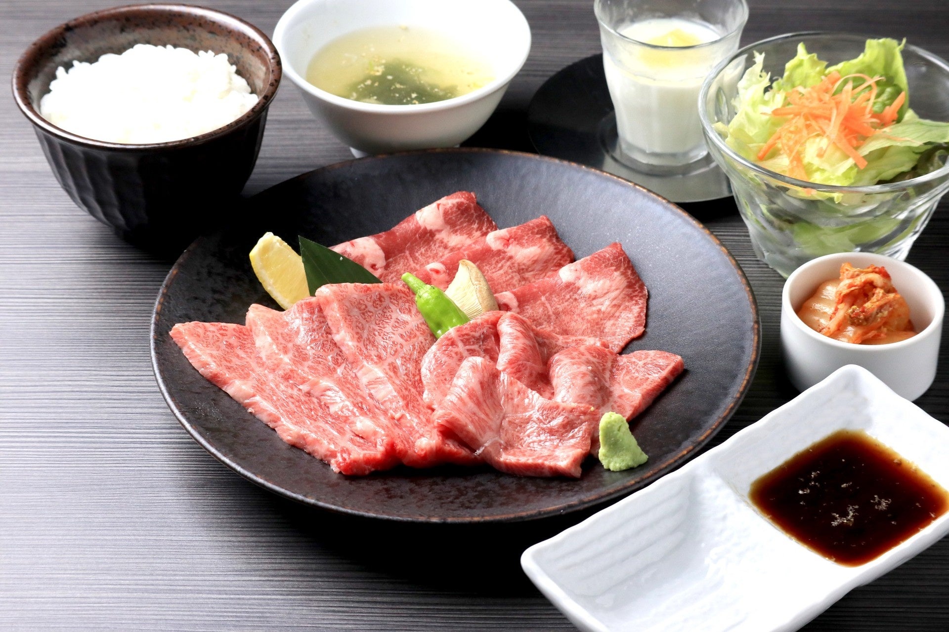 〈特上カルビ60g、特上あかみ60g、塩タン60g、サラダ、スープ、白菜キムチ、ご飯、ミニデザート〉