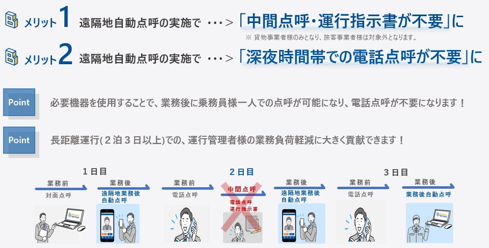 ☆長距離運行(2泊3日以上)での、【中間点呼】【運行指示書】が不要です(貨物事業者が対象)