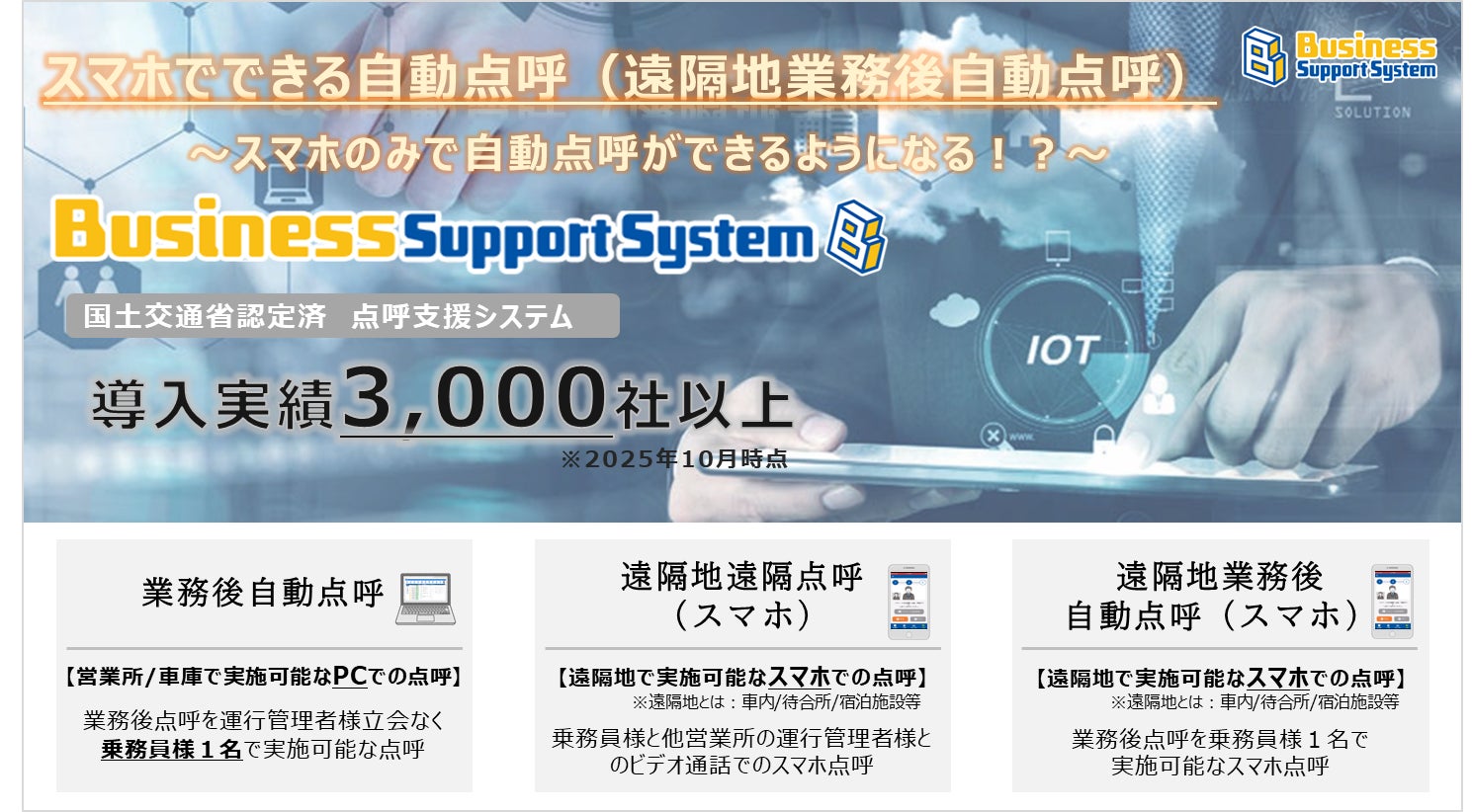BusinessSupportSystemにてスマホでできる自動点呼(遠隔地業務後自動点呼)機能をリリース‼