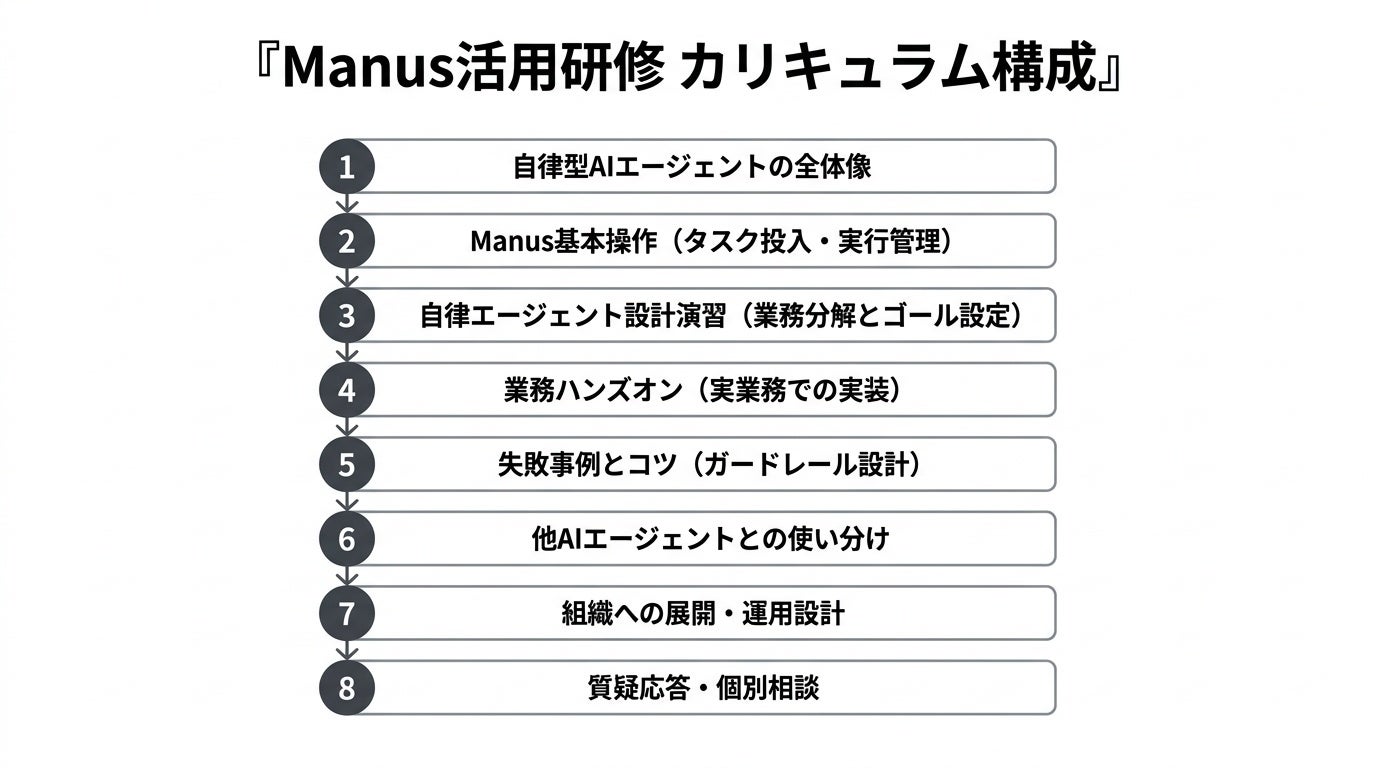 業務ハンズオン(実業務でのManus実装):受講者の実業務を題材にしたケーススタディ、職種別の活用パターン研究、成果物の品質チェック