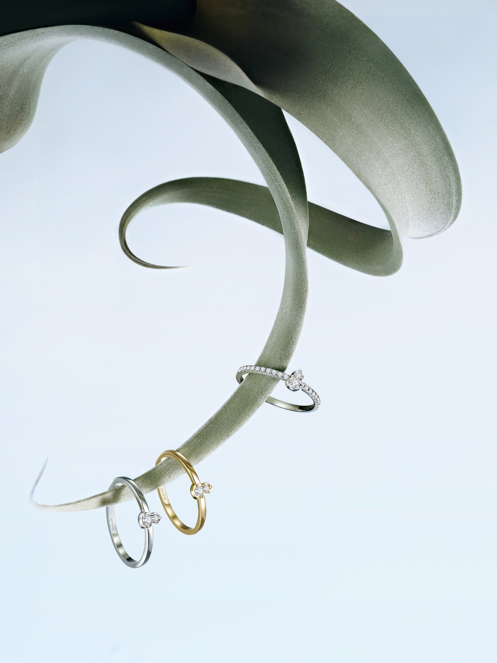 本コレクションは、装飾性よりもシンプルさを追求し本質へと立ち返ります。かすかなダイヤモンドの光が、所作のたびに静かに揺らめき、決して声高ではないながらも確かな強さを宿す、現代女性の佇まいを映し出します。単体で身に着ければ澄み切った意志を語り、重ねて纏えば個性を表現します。それぞれのピースは、指先や耳元、首元にそっと寄り添う、無言の詩のような存在となります。