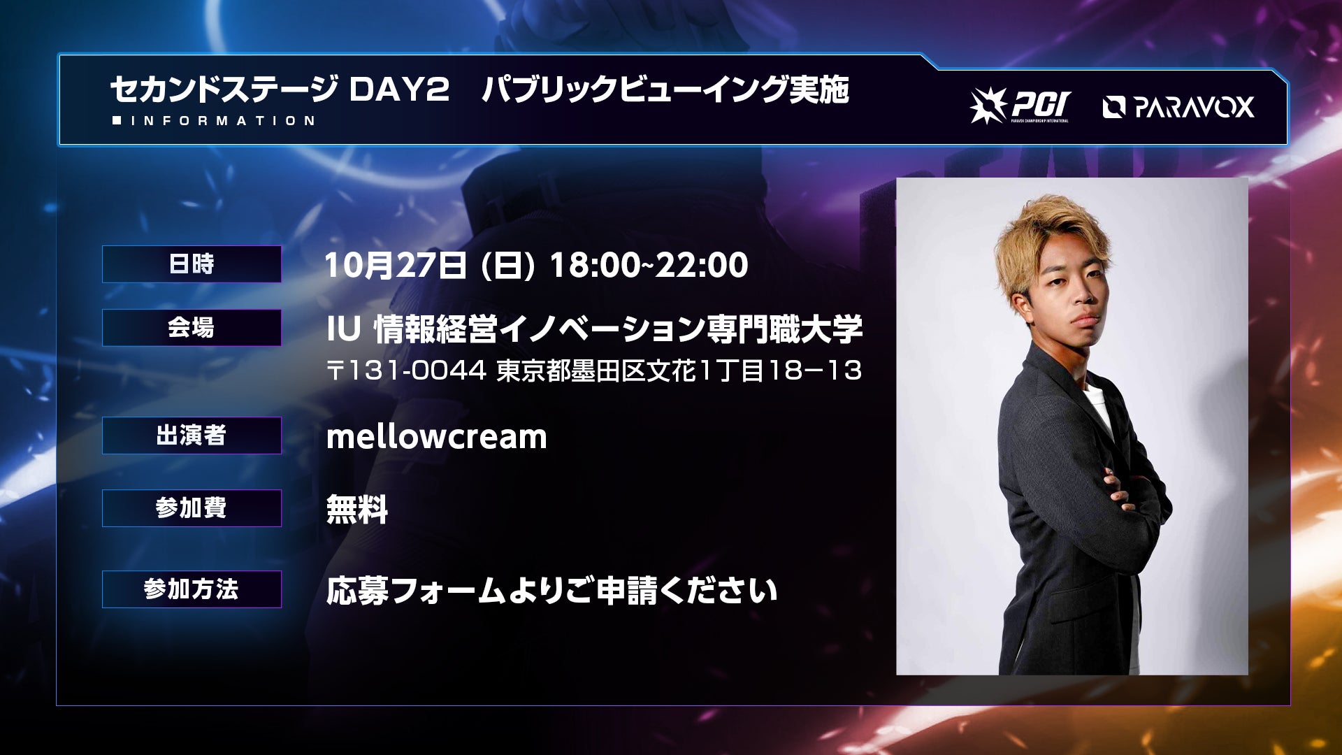 イベント会場では、PARAVOXの元プロ選手であるmellowcreamさんがリアルタイムで今回のセカンドステージの試合や選手についての解説を行ないます。