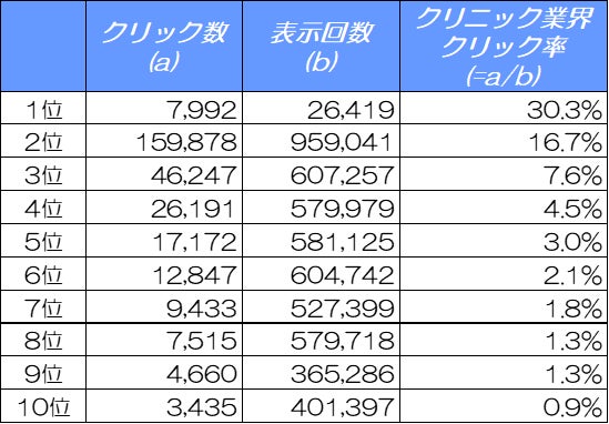 本データは、クリニックがSEO戦略を立てる際に、「どの順位まで上げれば目標とするクリック数を見込めるか」を判断するための有用な指標となります。