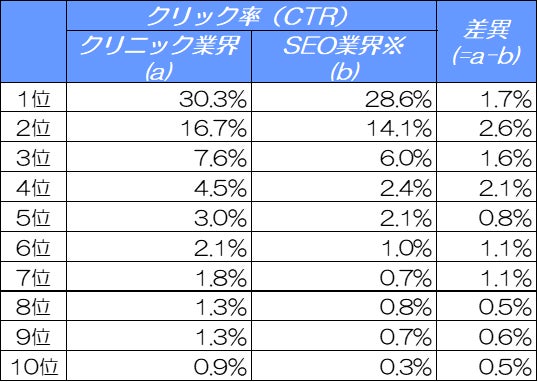 このデータは、検索上位10位までにおけるクリック率(CTR)を、クリニック業界とSEO業界※(比較対象としての基準データ)で対比したものです。全ての順位でクリニック業界のCTRがSEO業界を上回っており、その差は1位で1.7ポイント、2位で2.6ポイントと、上位表示ほど顕著な傾向が見られます。