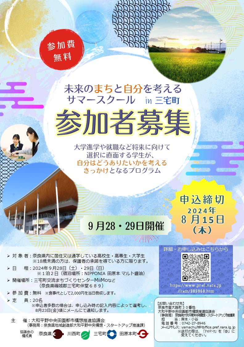 大和平野中央田園都市構想推進協議会(事務局:奈良県)による「未来のまちと自分を考えるサマースクール in三宅町」参加者募集中!