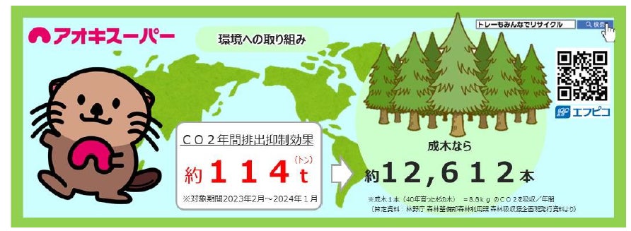 お客様のご協力により、2023年度は約874万枚(重量約57.8t)の食品トレーを店頭で回収し、 約114t分のCO₂を削減いたしました。
