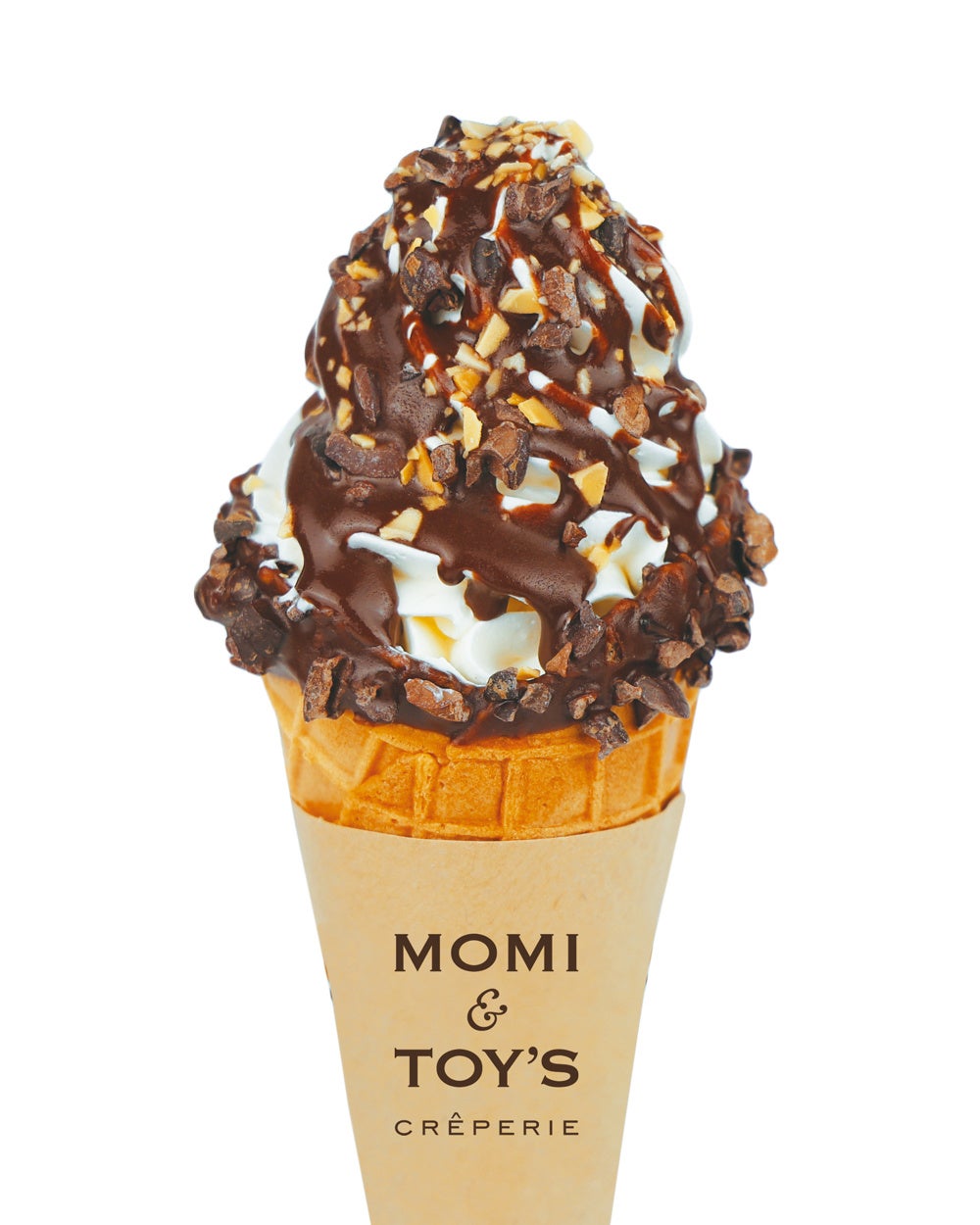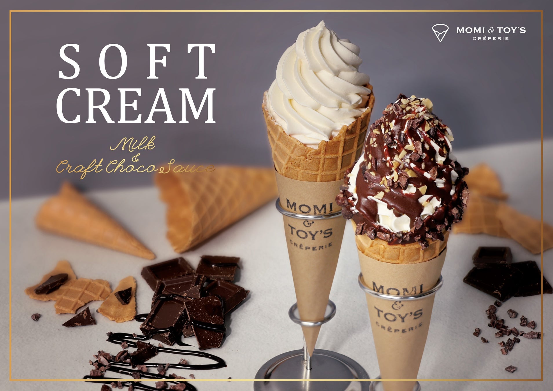 MOMI&TOY'Sでは主力である『とろけるクレープ』の生地、ホイップ共に「とろける」食感にこだわり、商品を提供しています。『ソフトクリーム クラフトチョコソース』は「くちどけの良さ」にこだわり、九州から取り寄せた乳脂8%でなめらかな舌触りのソフトクリームに、エクアドル産のカカオ豆を使い国内で製造した国産のクラフトチョコレートをかけ、香ばしいカカオニブをトッピングする事で贅沢感ある大人向けのソフトクリームに仕上げました。