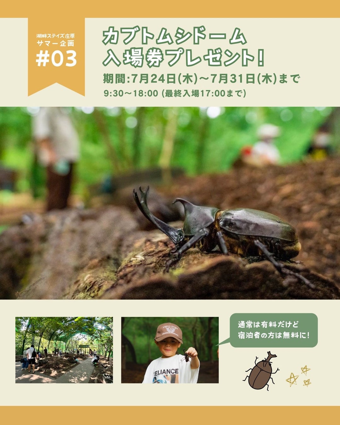 豊かな自然に包まれた里山で、2025年6月1日(日)から8月31日(日)までの期間限定で、夏ならではの特別な体験をご用意。静かな湖畔でリフレッシュ「朝ヨガ体験」、家族みんなで楽しめる「ピザ窯体験」、さらに園内の人気スポット「カブトムシドーム」への入場が無料になる特典など、ここだけの体験が満載です。