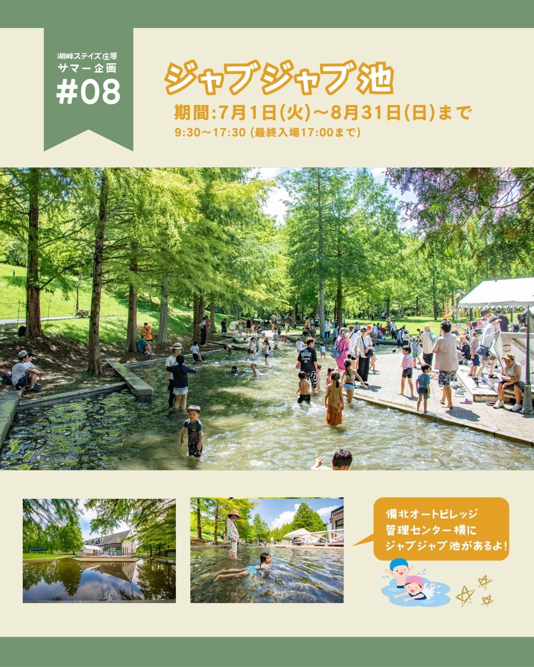 「ふるさと・遊び」をテーマにした国営備北丘陵公園では、四季折々の自然体験が楽しめます。ご宿泊の皆さまには、公園の入園料・駐車料も宿泊費に含まれておりますので、夏の人気スポット「ジャブジャブ池」など、園内の施設を思う存分ご利用いただけます。