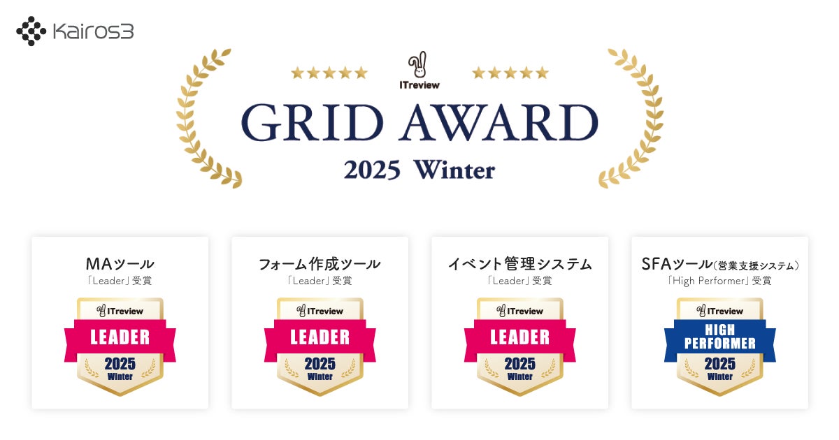 カイロスマーケティング株式会社(本社:東京都渋谷区、代表取締役:佐宗 大介、以下「当社」)が提供する、MA/SFA一体型プラットフォーム「Kairos3(カイロススリー)」は、「ITreview Grid Award 2025 Winter」において、3部門にて「Leader」、1部門にて「High Performer」を受賞したことをお知らせいたします。