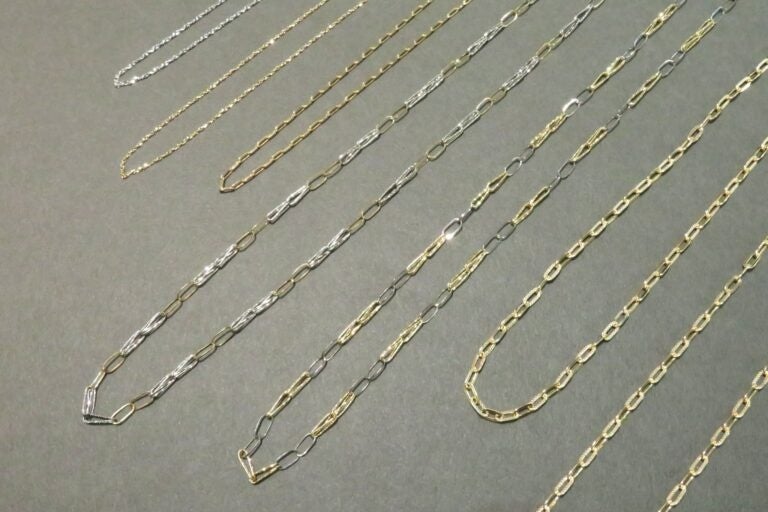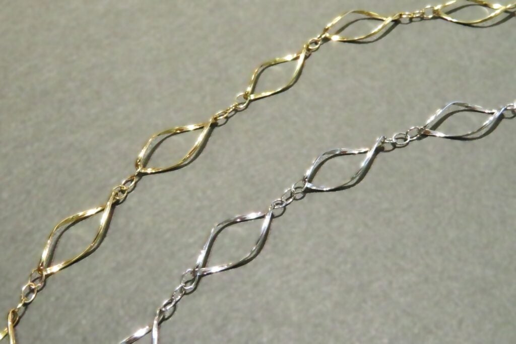 繊細なカットを施した線材を、職人の手で一つずつ丁寧に組み上げたデザインチェーン。