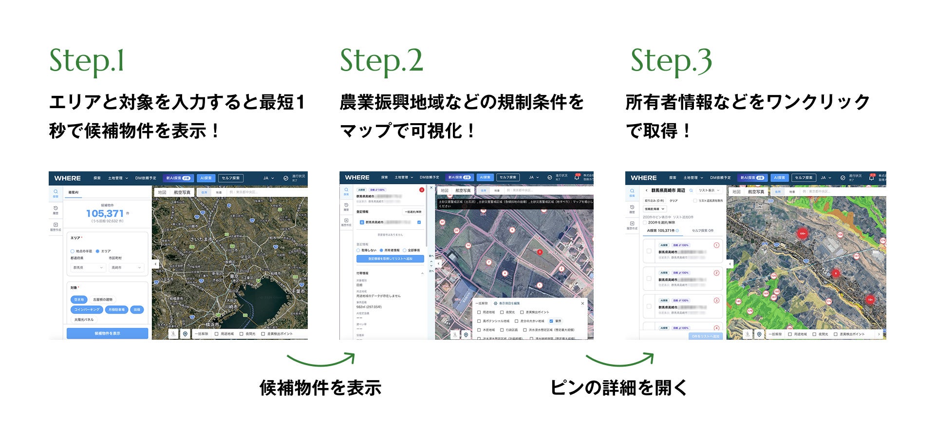 『WHERE』は衛星データ×AIによる候補地探索、行政・ハザード情報の統合スクリーニング、地権者への直接アプローチをワンストップで提供し、再エネ開発の初期検討プロセスを効率化する「ENERGYアップデート版」を、2025年10月よりリリースいたしました。