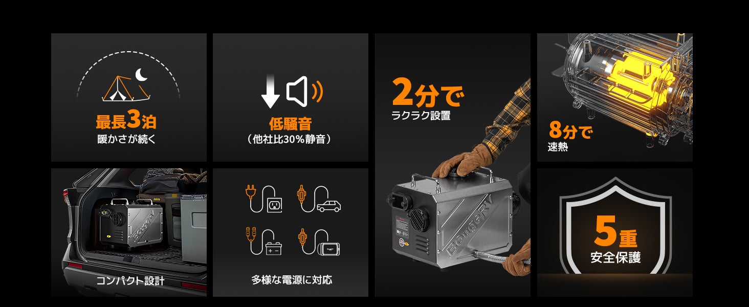 「BougeRV FFヒーター」が、従来のFFヒーターで課題とされていた騒音問題・燃焼の低安定性・日本語対応不健全・操作性の粗さを根本から見直し、完全に刷新しました。静音性・信頼性・使いやすさを高次元で両立した次世代のディーゼルヒーターとして、冬季のキャンプや車中泊など、寒さが一段と厳しくなるこれからの季節、アウトドアや車中泊をより快適に楽しめるようにサポートいたします。