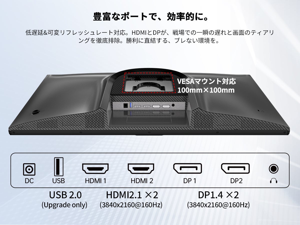DisplayPort 1.4×2: 高性能ゲーミングPCと接続し、4K@160Hz の最高品質表示を実現。2系統あるため、PCを2台接続するようなマルチタスク環境にも最適です。
