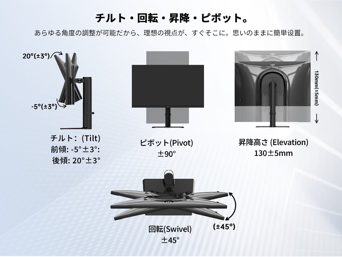 U27T6は、あらゆるゲーミング環境と姿勢に柔軟に対応するため、全方位調整可能なスタンドを標準装備。チルト(前後傾斜:-5°〜20°)、スイベル(水平回転:±45°)、ピボット(垂直回転:±90°)、昇降(130mm) のあらゆる調整が可能です。お好みの視野角と高さに精密に調整することで、長時間のゲーミングセッションでも最高の快適性を維持し、首や肩への負担を軽減します。