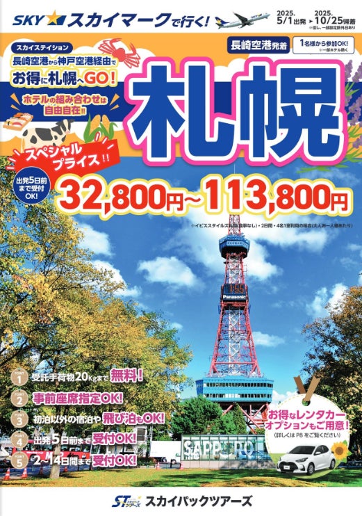 スカイパックツアーズ株式会社(本社:東京都中央区、社長:横山正巳)は、スカイマークを利用した価格固定型のパンフレット旅行商品「スカイステイション 北海道」【長崎空港発着】(2025年5月1日出発~10月25日帰着)の販売を開始します。