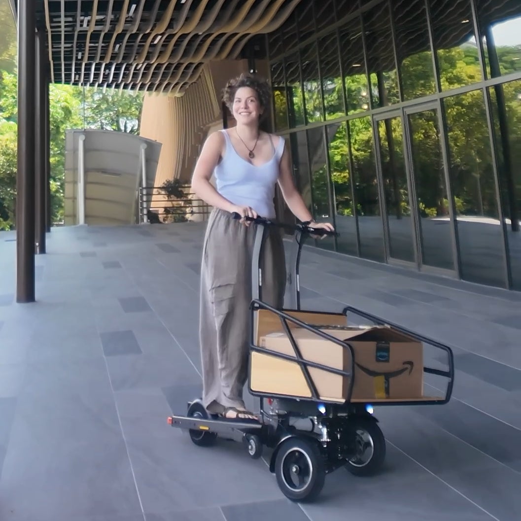 変形可能なカーゴスクーターは、人の移動だけでなく、建物から建物への荷物の運搬もシームレスに行えます。わずか3秒でトロリー(台車)に変形できるため、エレベーターや屋内空間でもスムーズに使用可能です。街の中を移動する際や、業務用の荷物を持ち運ぶ用途としての活用を想定しています。