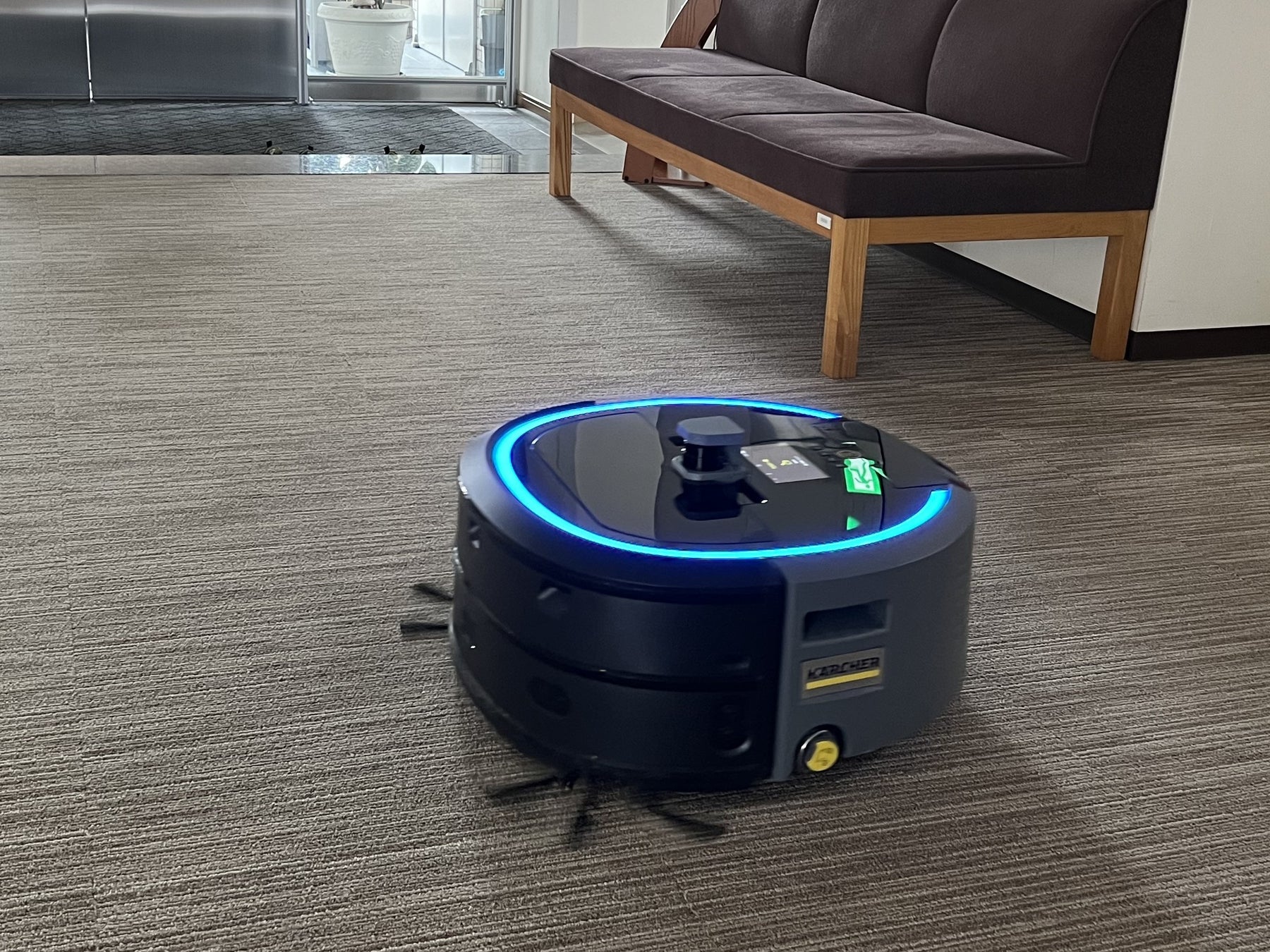 除塵型清掃ロボット「KIRA CV 50」は、高い吸塵力と機体サイズを活かした清掃性能が特長です。直径約58センチのコンパクト設計により、狭いベンチ下にも入り込めるほか、ツインブラシで壁面ギリギリまで接近しながら清掃できます。コンベンションセンターのような上質空間にも映える清掃ロボットとして期待されます。