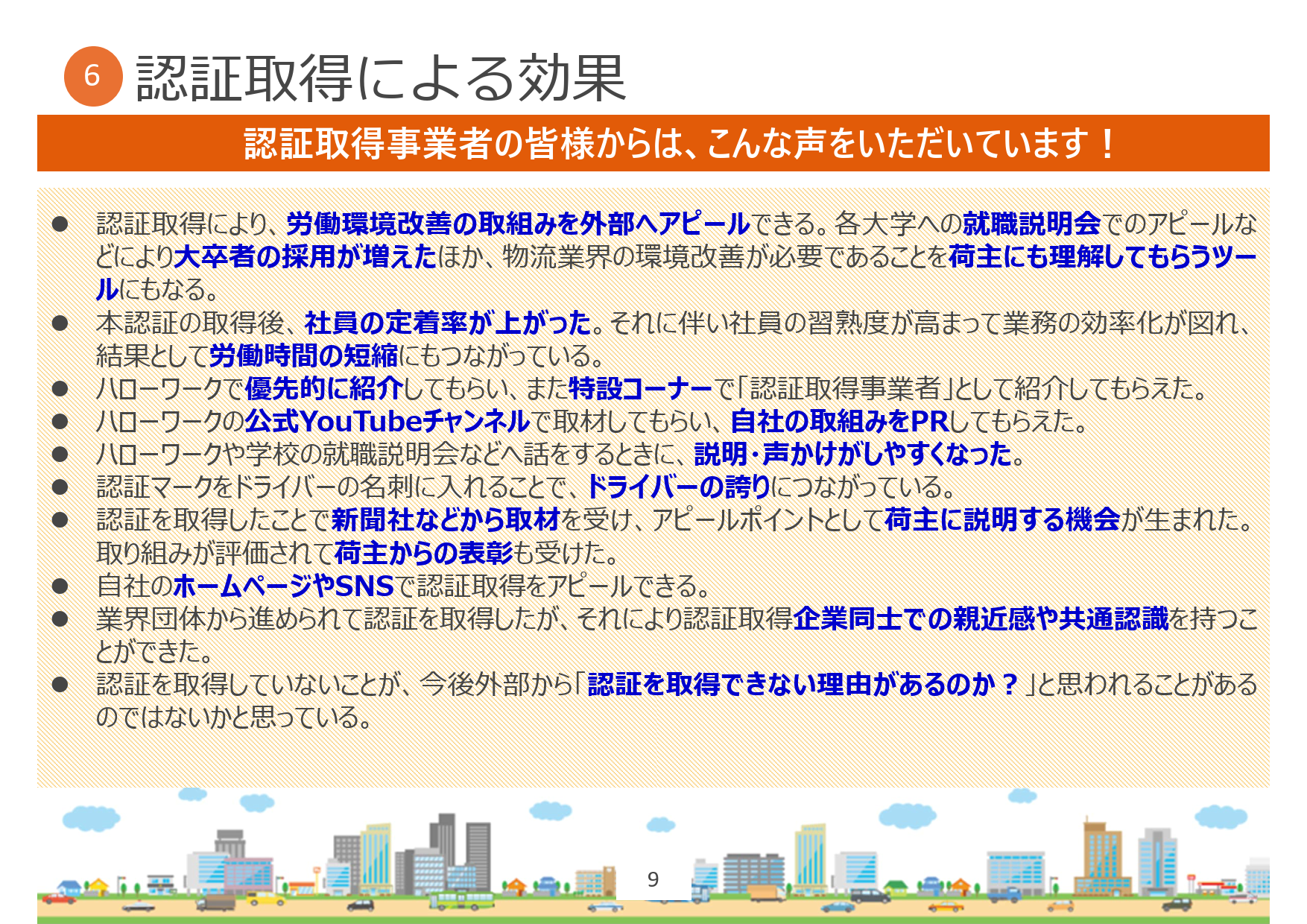 女性ドライバーの積極採用、年間休日の取得数増加、時間外労働の短縮、心と体を守る取り組みなど、働く人ひとりひとりのためにより良い職場環境の実現を目指しており、職場選びの目印となります。