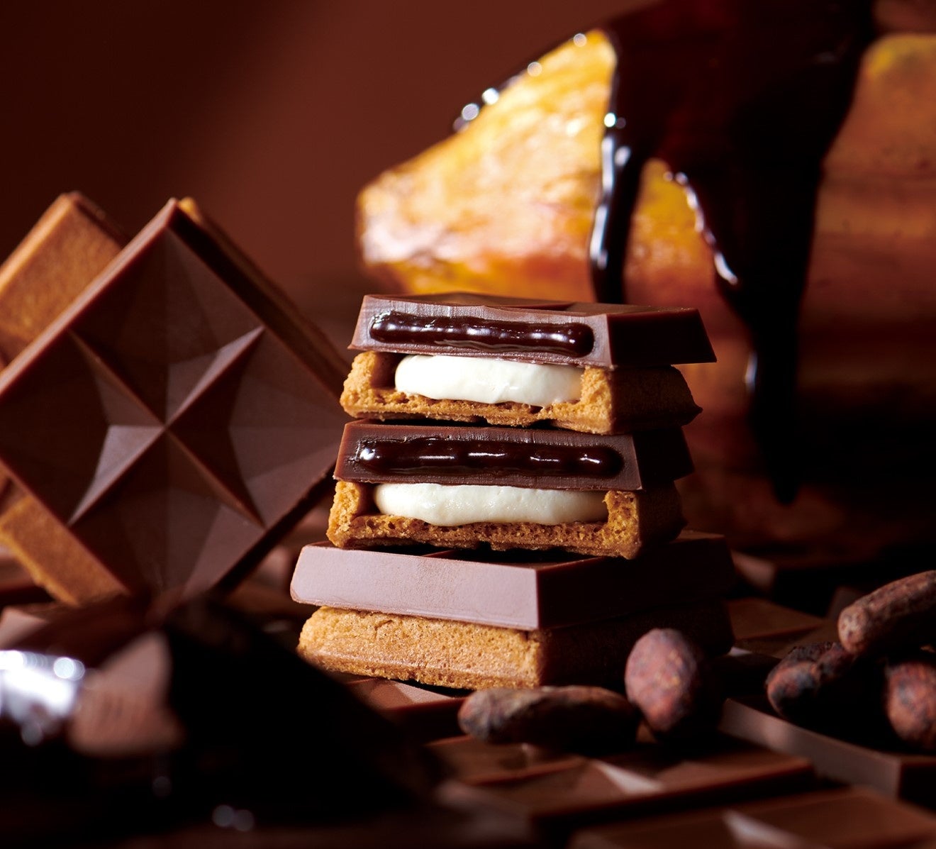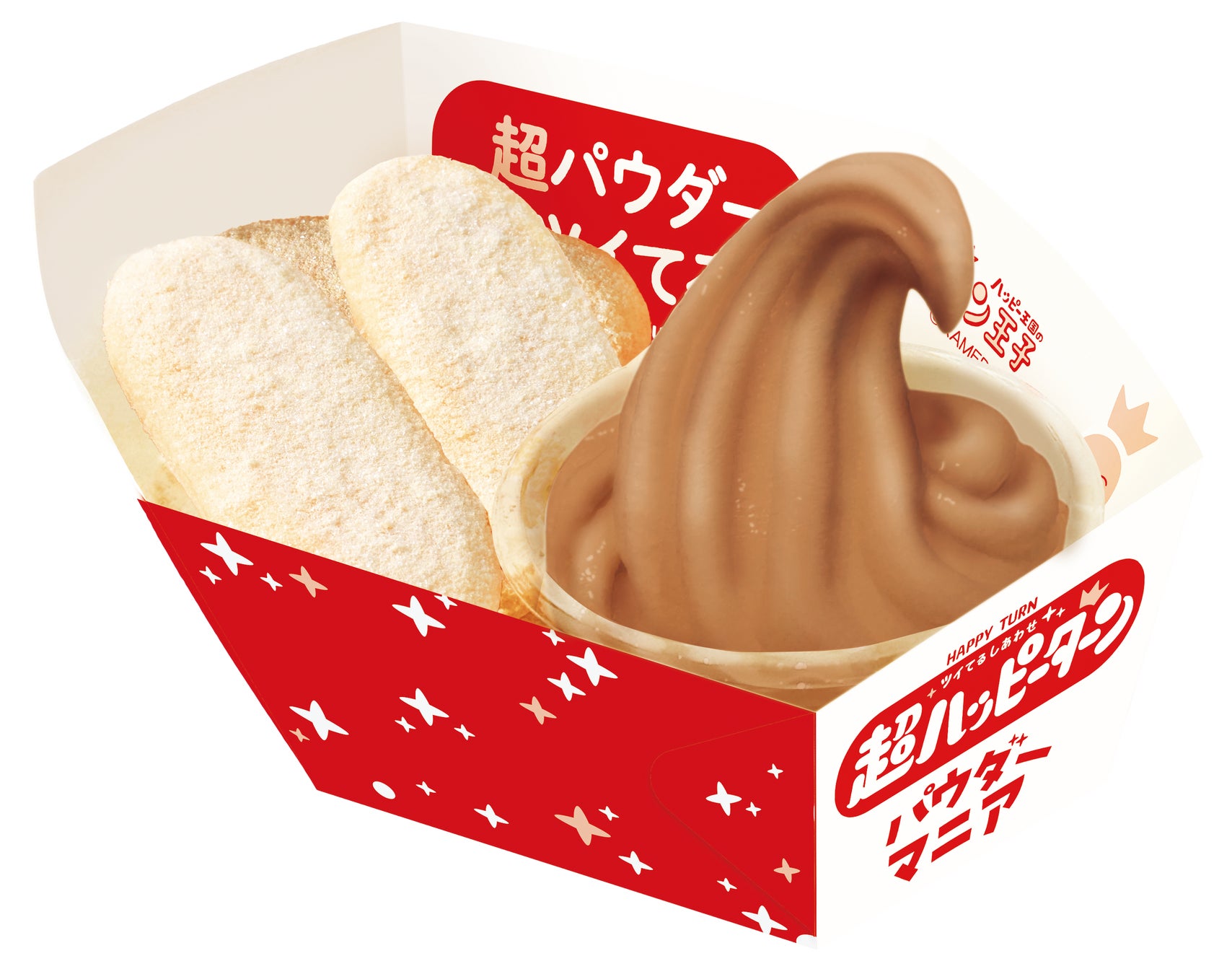 パウダー約3倍のハッピーターンを、チョコソフトにディップしてお楽しみいただけます。