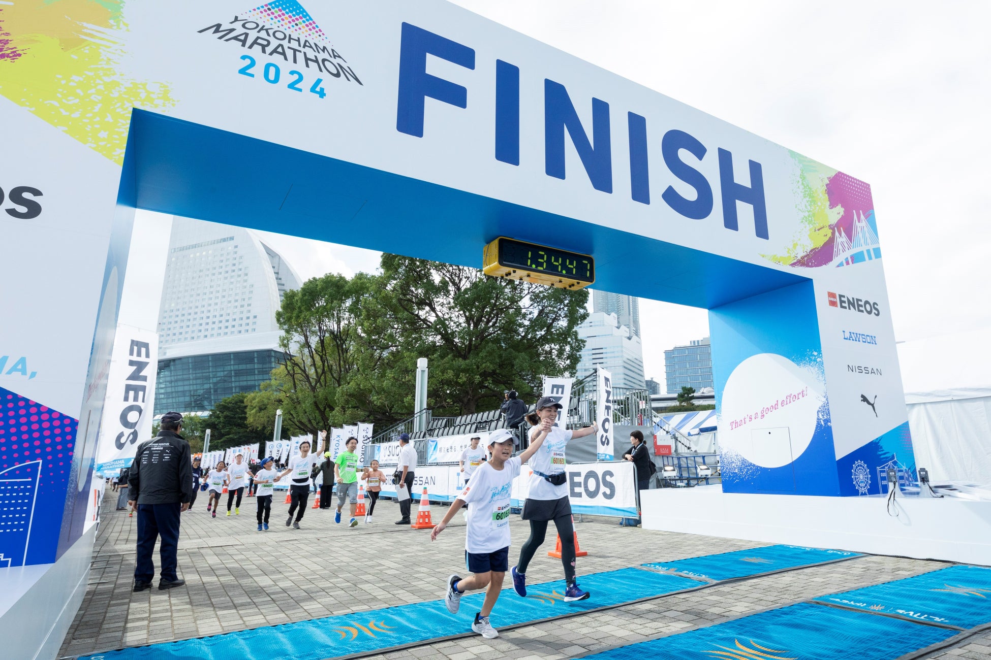 今大会は、フルマラソン化10周年を記念して制作したロゴを中心にしたシティドレッシングで横浜のまちを彩り、横浜マラソンまでの盛り上がりを演出。さらに大会前日は、10周年記念事業として、「フィニッシュテープを切ってみよう!&バックヤードツアー」を開催し、1/100フルマラソンとして、親子で421.95mを走り抜けます。