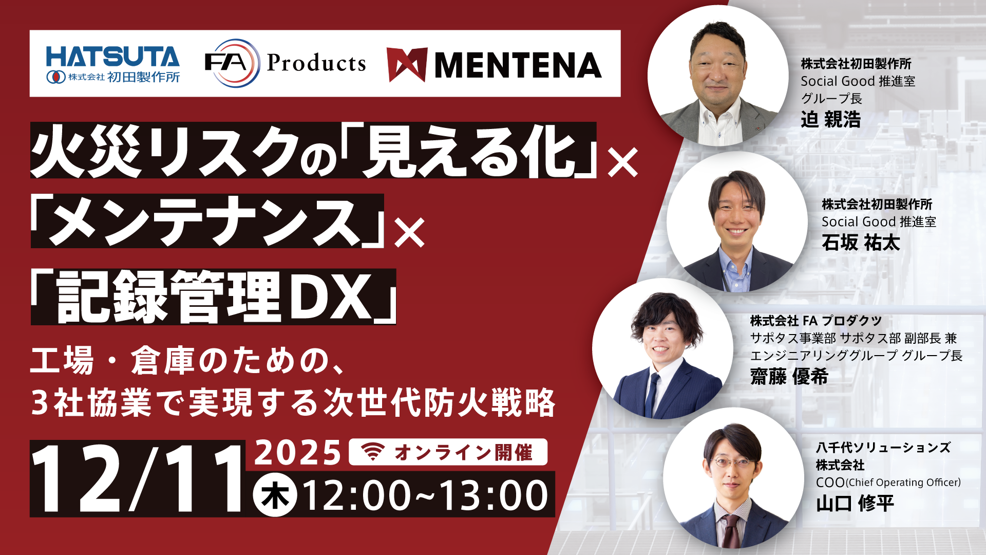 クラウド設備管理システム「MENTENA(メンテナ)」を提供する八千代ソリューションズ株式会社(本店:東京都台東区、代表取締役社長:水野高志)は、「火災リスクの「見える化」×「メンテナンス」×「記録管理DX」〜工場・倉庫のための、3社協業で実現する次世代防火戦略〜」と題した共催ウェビナーを2025年12月11日(木)に開催します。