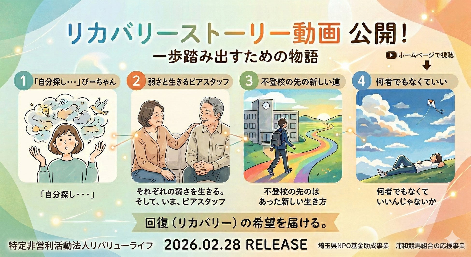 埼玉県川越市を拠点に活動する特定非営利活動法人リバリューライフ(所在地:埼玉県川越市、共同代表:竹内 善太)は、依存症や不登校、挫折など、人生の様々な困難を経験しながらも、自分らしい生き方を見つけ出した方々の歩みを記録した「リカバリーストーリー」動画4編を、2026年2月28日より公式ウェブサイトにて公開いたしました。