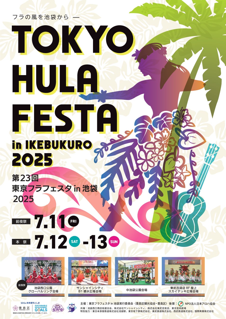 「東京フラフェスタ」は、毎年夏に池袋を舞台として行われる、都内最大級のフラダンスイベントです。国内外からフラ愛好家が集まり、ハワイ文化と地域の魅力が融合する本イベントは、豊島区の夏の風物詩として多くの人々に親しまれています。