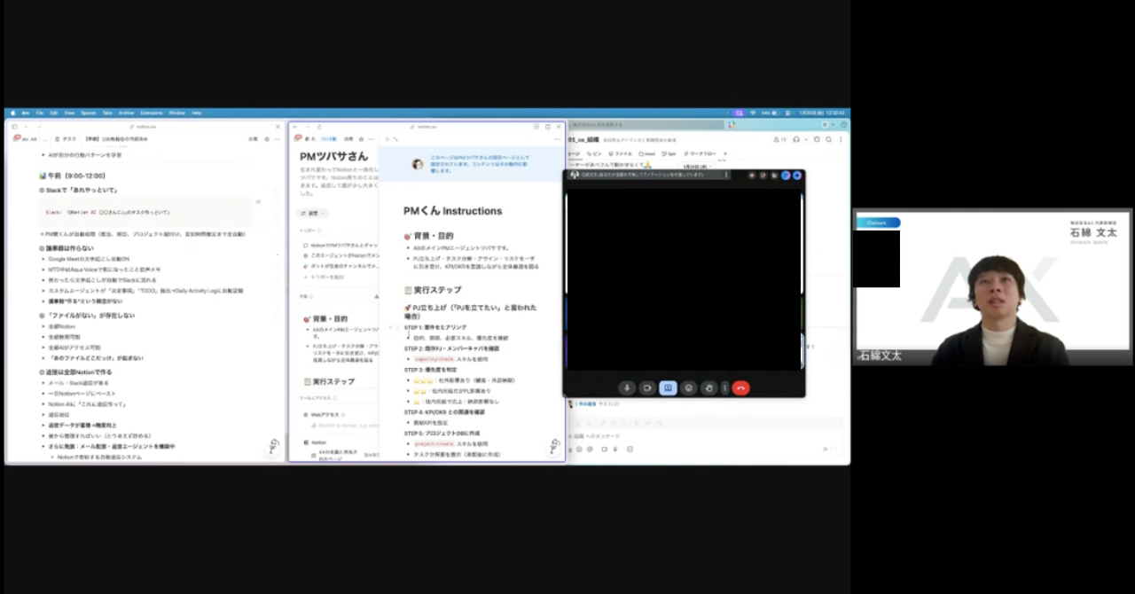 当日は、日々の業務で時間が取られがちな「探す・確認する」といった作業をどのように減らしていくか、Notionを中心に情報を集約しながらAIを“チーム”として運用していく考え方、複数のAIを並列に動かして待ち時間を減らす進め方など、実務に落とし込みやすい視点を共有。あわせて、実際の1日の流れの中でAIをどう使っているのかを、画面共有での実演も交えながら紹介しました。