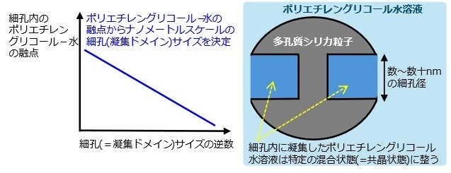 加えて、PEG水溶液をナノサイズの狭い空間に閉じ込めると、濃度に依らず “最も固まりやすく、最も安定な特定の混合状態(=共晶状態※5)”へと自発的に整うことが明らかとなりました(図2右図)。この知見は、ナノ多孔体を利用した PEG水溶液の分離・精製・濃縮技術などへの応用につながる可能性を有しています。
