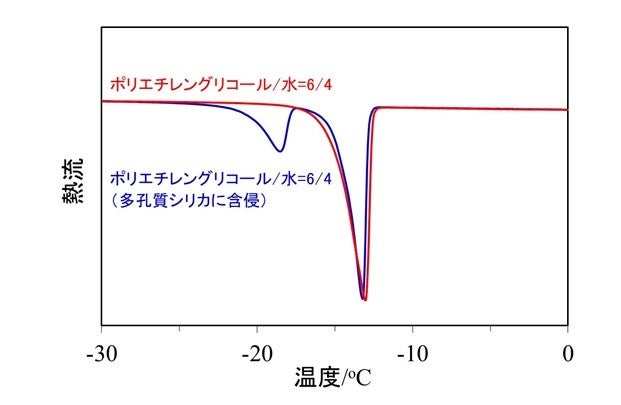 これに対して我々研究チームは、水がナノスケールの空間に閉じ込められると融点が低下する現象に着目しました。細孔径が既知のシリカ多孔体にPEG水溶液を含侵させ、示差走査熱量測定(DSC)※4により融点を測定したところ、通常のPEG水溶液に由来する高温側の融点に加え、ナノ空間に閉じ込められたPEG水溶液に由来する低温側の融点(低温側)が観測されることを確認しました(図1)。
