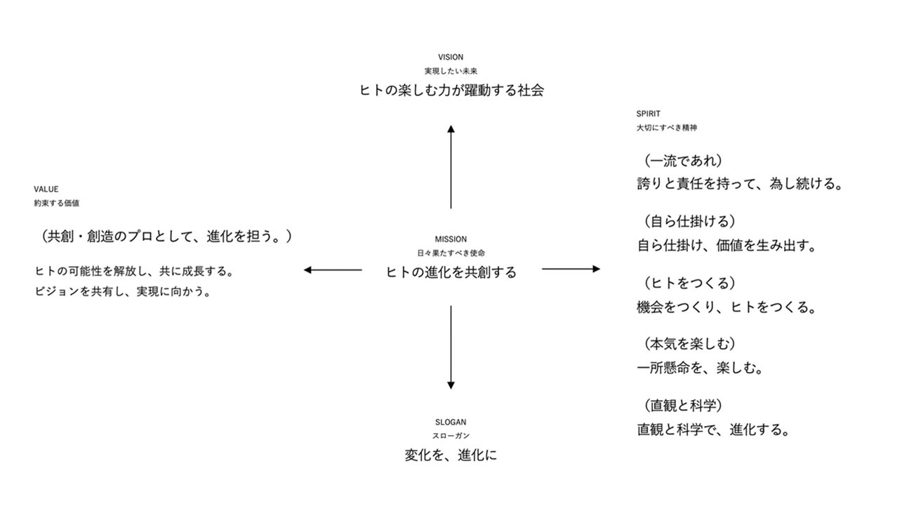 企業として日々果たすべき使命を「ミッション」として企業理念の軸に置き、それを続けた先に実現したい未来を「ビジョン」、ミッションを達成するために顧客に約束する価値を「バリュー」、バリューを発揮するために社員一人ひとりが大切にすべき精神を「スピリット」としてそれぞれ言語化しました。