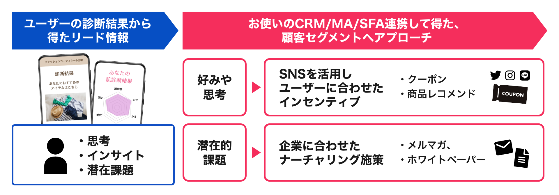 顧客が設問に答え収集した情報を自動的にリードプロファイルとして分類ができ、企業はこのプロファイルを活用し、顧客に対して、よりパーソナライズされたメッセージやオファーを提供することができます。さらに、ヨミトルはCRMやSFAとの連携を強化することで、リード情報をリアルタイムで同期することが可能です。これにより、マーケティング・営業チームは収集したリード情報を直接CRMやSFAに統合し、より正確で効果的なターゲットリストの作成や、顧客のニーズや嗜好に合わせたパーソナライズされた効率的な営業活動を実現できます。