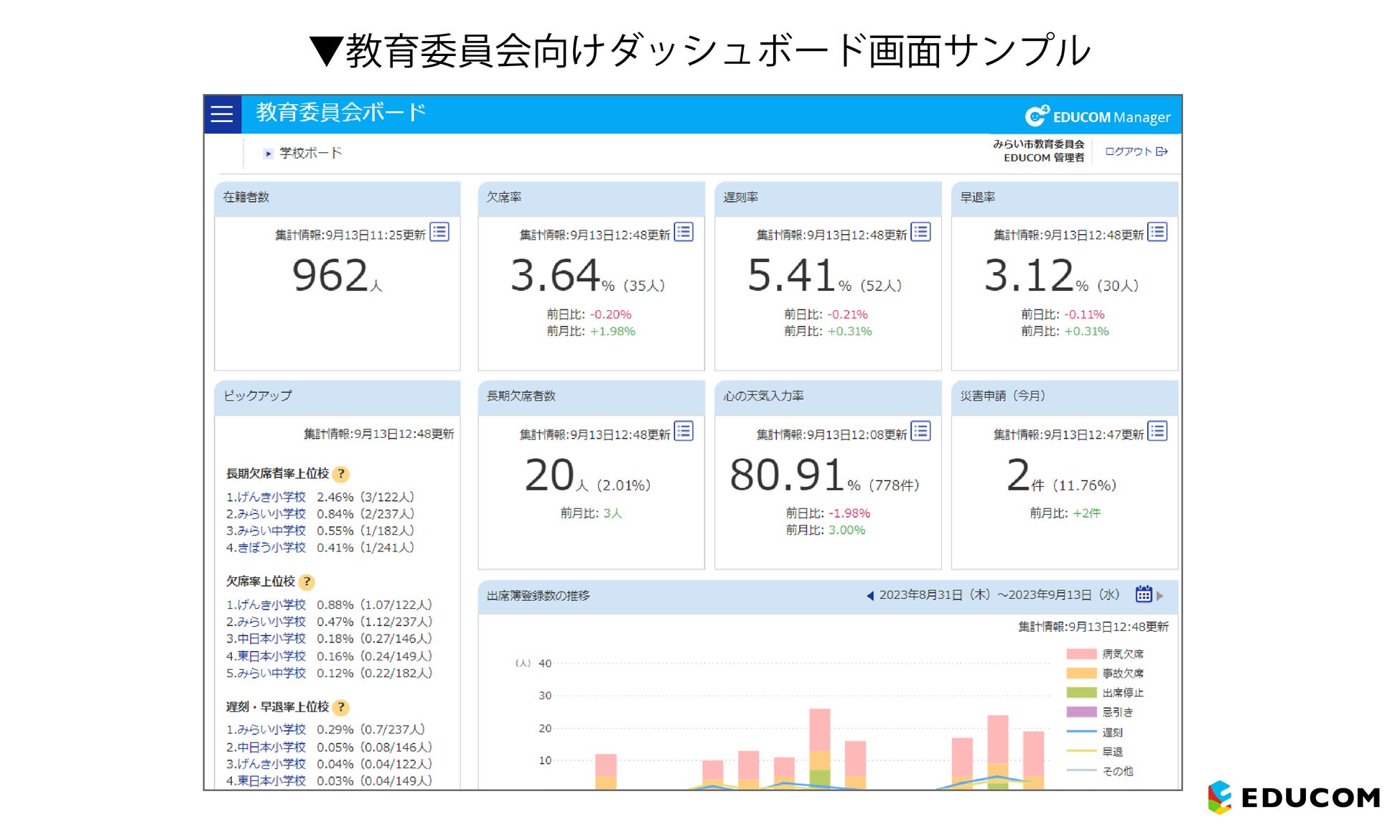 全国の小・中・高等学校に学校支援システムを提供する株式会社EDUCOM(読み:エデュコム、本社:愛知県・東京都、代表取締役CEO兼COO:小林 泰平 、以下EDUCOM)の統合型校務支援システム(*1)「EDUCOMマネージャーC4th」(読み:エデュコムマネージャーシーフォース、以下、C4th)は、学校が自校全体の情報をサマリとして閲覧できるダッシュボード機能と、教育委員会が自治体全体の情報をサマリとして閲覧できるダッシュボード機能をリリースします。