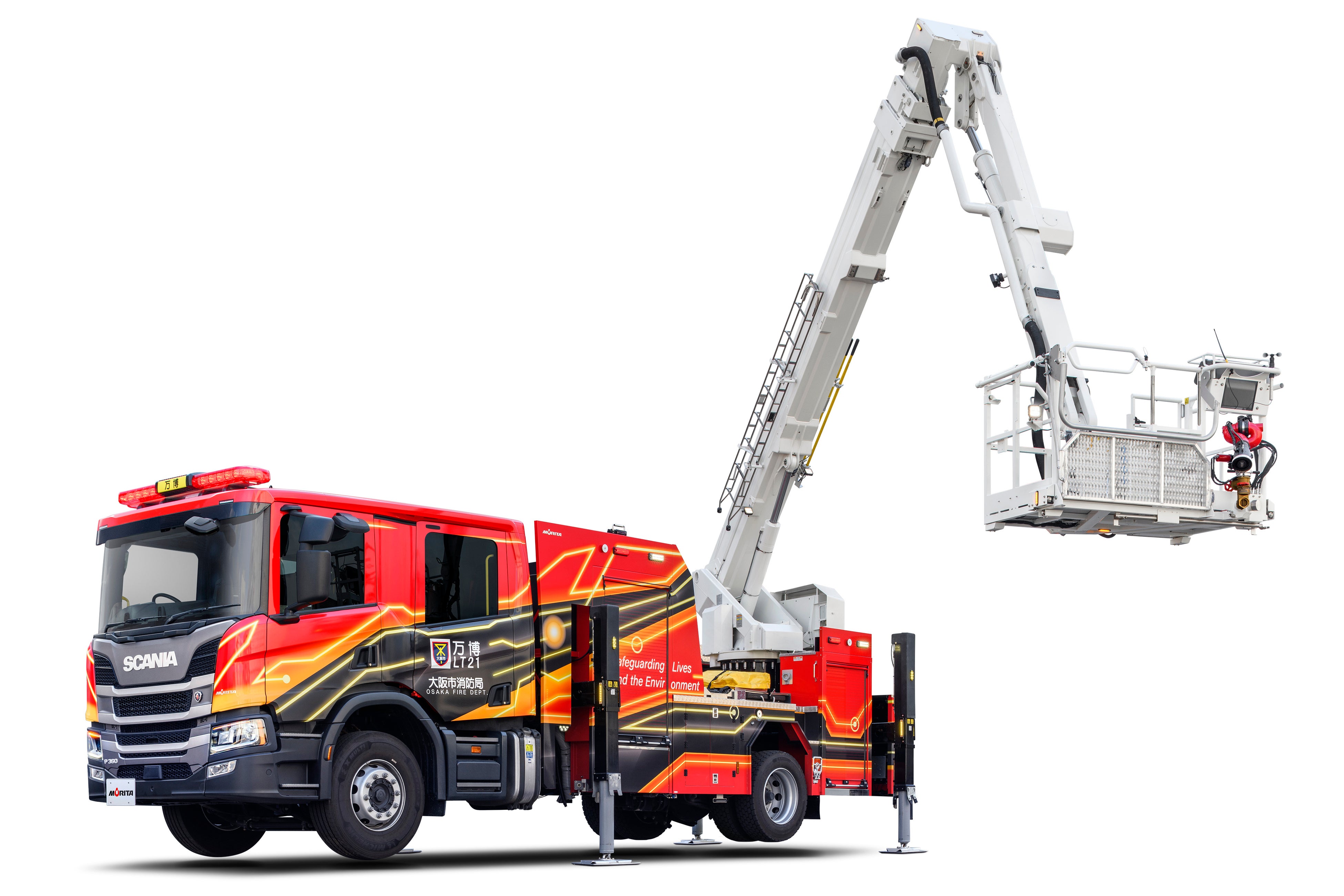 複雑な形状のパビリオンを持つ会場での災害を想定し、先端が屈折するブームに加え、車椅子のまま救助できる国内最大級のバスケットを持つMVF21を協賛。会場内の予防巡回業務に使用するEV巡回車には360度カメラと通信機能を搭載し、災害時はカメラ映像を指揮システムにライブ配信するとともに、移動式通信中継器として現場のネットワークを構築いたします。