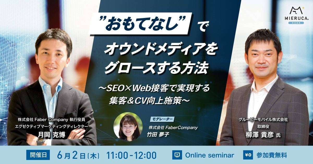 新サービスの説明も踏まえて「”おもてなし”でオウンドメディアをグロースする方法~SEO×Web接客で実現する集客&CV向上施策~」( https://mieru-ca.com/blog/seminar/20220602/ )と題してオンラインセミナーを開催します。ぜひご参加ください。