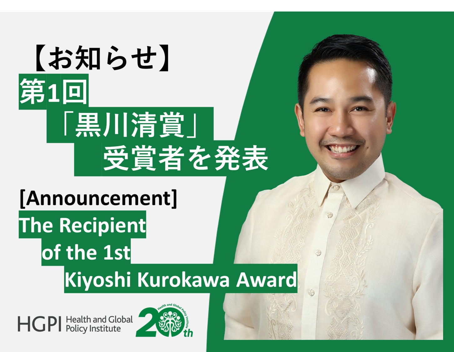 本賞は、広範な分野から推薦された候補者を対象に、国内外の専門家からなる選考委員会による厳正な評価を経て受賞者を決定しました。選考では革新性と社会的インパクト、候補者の持つ将来性が特に重視されました。黒川清賞を通じて、HGPIはアジア太平洋地域における革新的な取り組みを世界に発信し、持続可能な医療政策の実現に向けて新たな議論を促進してまいります。