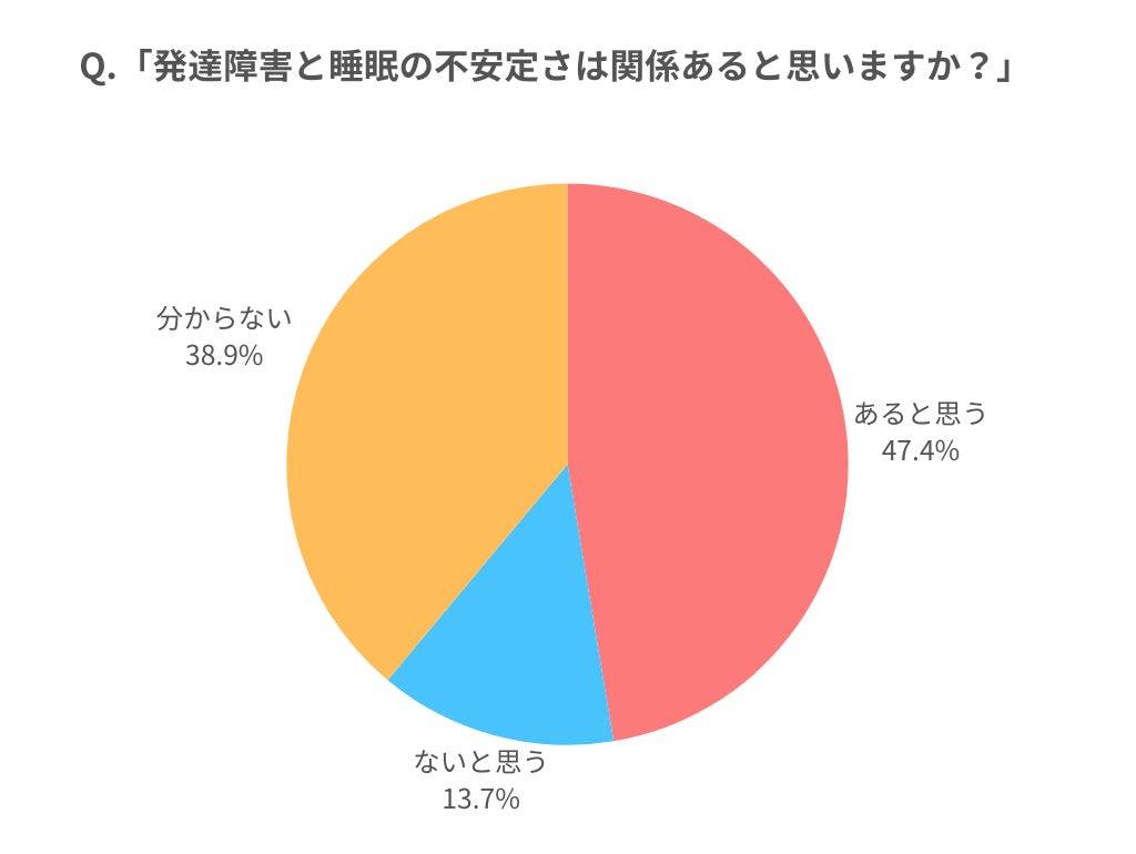 調査の結果、発達障害と睡眠の不安定さは関係が「あると思う」「分からない」と回答した方が全体で90%近く占める結果となりました。