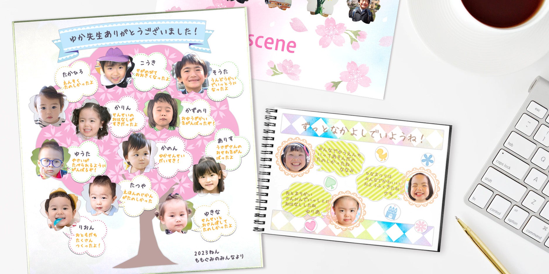 お世話になった先生への寄せ書きや、手作り卒業アルバムの装飾におすすめです。クラスやお友達の写真でフォトシールを作成し、メッセージやコメント添えれば、心のこもった記念品が簡単にできあがります。