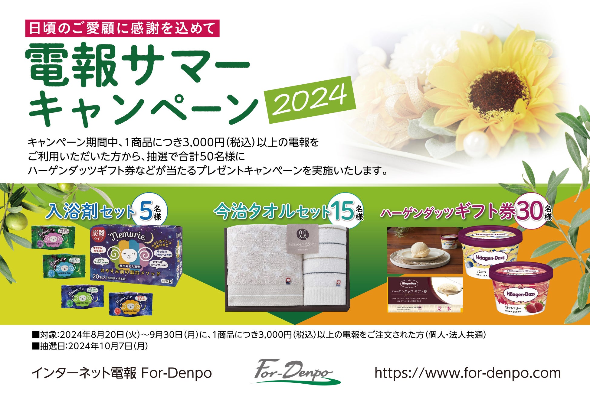 インターネット電報サービス『For-Denpo』( https://www.for-denpo.com/ )を提供する株式会社プライムステージ(所在地:広島県広島市、代表取締役:溝口 暁子)は、2024年8月20日(火)~9月30日(月)の期間中、1商品につき3,000円(税込)以上の電報をご利用いただいたお客様の中から抽選で50名様に、入浴剤や今治タオル、ハーゲンダッツギフト券が当たる電報サマーキャンペーンを実施いたします。
