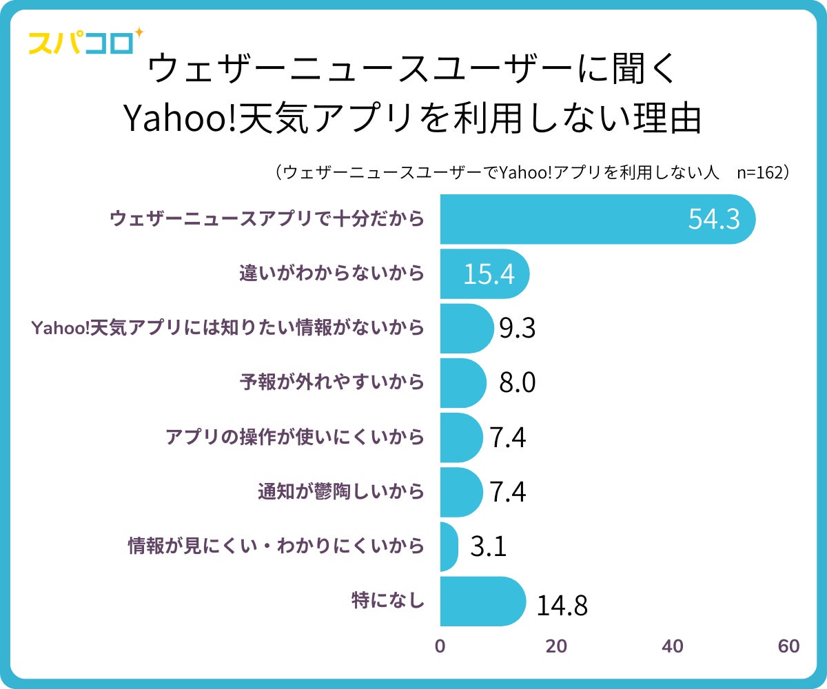Yahoo!天気アプリをを利用しない理由TOP5は、「ウェザーニュースアプリで十分だから」(54.3%)でした。次いで「違いがわからないから」(15.4%)、「Yahoo!天気アプリには知りたい情報がないから」(9.3%)、「予報が外れやすいから」(8.0%)、「アプリの操作が使いにくいから」(7.4%)でした。)