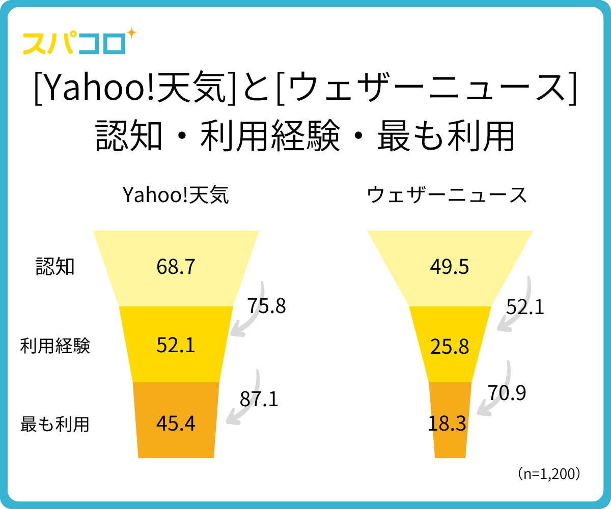天気アプリで利用率の高かった「Yahoo!天気アプリ」と「ウェザーニュース」を比較すると、認知率・利用経験率・最も利用している人の割合のすべてで「Yahoo!天気」が大きく上回る結果となりました。ユーザーが認知してからアプリを利用し、最も利用するに至るまで一貫して高い割合をキープしており、「Yahoo!天気アプリ」のサービス離脱者の少なさが伺えます。